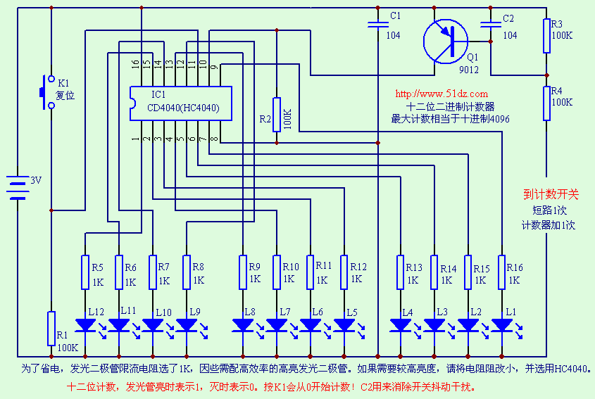 灯亮表示1,灯灭表示0,本电子制作对学习认识二进制数非常有帮助,该制作也可用于各种简易的计数需要,例如简易生产线产品计数等。