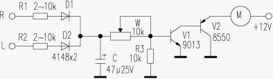 为此笔者将其改为声控风扇,使其在静态或小音量放音时,风扇不转,待功放输出一定幅度的信号电压时,风扇电机才转动,从而有效解决了风扇的噪声问题。其电路如下图所示,R1、R2阻值视功放输出功率大小可在2k~10kΩ之间选择,C的作用除使风扇运转平稳外也起到延时运转作用,调节W时可改变控制灵敏度。