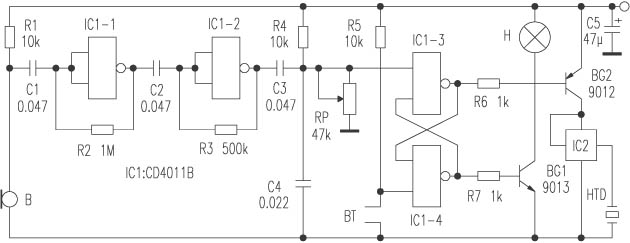 B是驻极体话筒,吹蜡烛时,吹气声由B拾取,经IC1-1、IC1-2放大后触发RS触发器翻转,灯熄乐停。