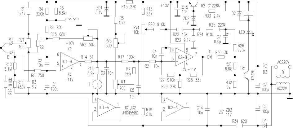 T是一个磁电式微安表,用来监视电热炉内的工作温度。热电动势信号经IC1-B放大后从{7}脚输出负信号电平,一路经R16加到温度表下;另一路去控制电路,R15、RV2为负反馈元件。