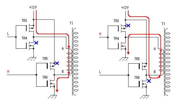 图9 由以上分析我们可以画出原理图中MOS场效应管电路部分的工作过程(见图10)。工作原理同前所述。这种低电压、大电流、频率为50Hz的交变信号通过变压器的低压绕组时,会在变压器的高压侧感应出高压交流电压,完成直流到交流的转换。这里需要注意的是,在某些情况下,如振荡部分停止工作时,变压器的低压侧有时会有很大的电流通过,所以该电路的保险丝不能省略或短接。