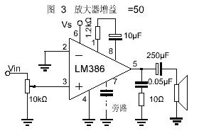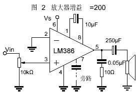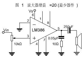 LM386是美国国家半导体公司生产的音频功率放大 器,主要应用于低电压消费类产品。为使外围元件最少,电压增益内置为20。但在1脚和8脚之间增加一只外接电阻和电容,便可将电压增益调为任意值,直至 200。输入端以地位参考,同时输出端被自动偏置到电源电压的一半,在6V电源电压下,它的静态功耗仅为24mW,使得LM386特别适用于电池供电的场 合。