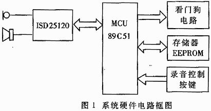 系统硬件电路框图如图1所示。ISD器件选用录音时间为120s的ISD25120器件,以单片机为处理机,外接控制每个语音段录音开始与停止按键,外部存储器EEPROM用于保存每个语音首地址。ISD的外围电路及其与单片机连接的硬件电路如图2所示。