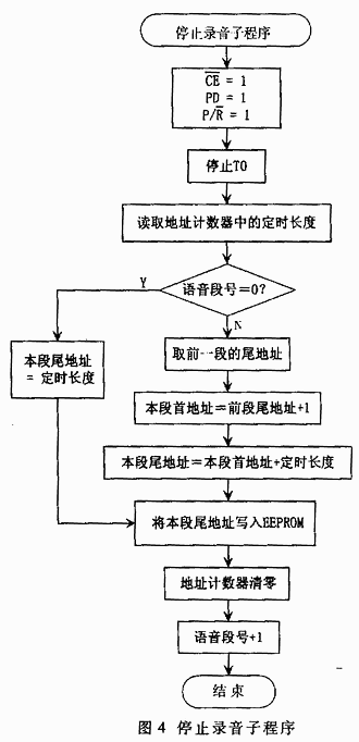 (1)ISD语音段尾的EOM标志并不是器件检测到语音结束时自动产生,实际是通过控制器件的工作方式来停止录音而产生的。在录音状态下将CE和PD置高时,则停止录音,在语音段尾产生EOM标志;同时ISD器件在播放时遇到段尾的EOM时也并不自动停止播放,必须用中断捕捉它后,再用软件停止播放。