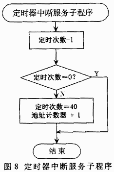 按照前面的分析和硬件原理图,软件部分主要涉及启动录音和停止录音、启动放音和停止放音、检测EOM信号的外部中断0、定时中断等六个子程序模块。播放语音时,语音段尾的EOM信号触发外部中断0,进入服务子程序。首先停止语音播放,然后设置下一段语音播放标志。各个语音段的组合播放顺序由主程序根据外部情况或设置情况自动变动,如在电缆故障自动定位仪中,测试出故障点后,根据故障点的距离组合存放数字的各个语音段进行播放。定时中断采用工作方式2,定时周期为5ms。为产生ISD25120每个信号段的200ms时间,设置一个定时计数器,计满40次定时周期即得到200ms的时间,产生一次中断。六个子程序模块的软件流程如图3~图8所示。