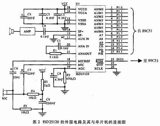 ISD与89C51的接口部分包含输入地址线A0~A9、片选CE(CE=0选中ISD芯片)、芯片低功耗状态控制PD、录放音控制选择P/R(P/R=0为录音;P/R=1为放音)、录放音结束信号输出EOM,将它作为89C51外部中断0的输入信号,放音时通过它告知本语音段结束,便于单片机立即播放另一个语音段;我们需要的语音总时间小于120s,溢出端VOF未用;若需要总时间大于120s,可经级联多个ISD25120,此时需要使用溢出端VOF。ISD25120一共需要11根控制线和一个外部是中断口,这里11根控制线使用89C51的P1和P3的部分端口,若系统中其它电路占用了部分P1,则可使用其它I/O口扩展器件(如82C55、373等)的扩展I/O口来控制ISD25120。ISD25120的其它管脚所连电路为典型外围器件配置,用于模拟语音的输入输出。