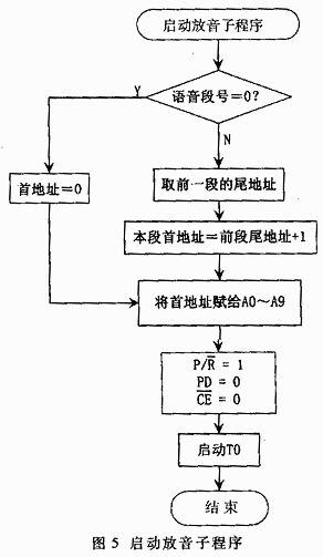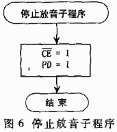 按照前面的分析和硬件原理图,软件部分主要涉及启动录音和停止录音、启动放音和停止放音、检测EOM信号的外部中断0、定时中断等六个子程序模块。播放语音时,语音段尾的EOM信号触发外部中断0,进入服务子程序。首先停止语音播放,然后设置下一段语音播放标志。各个语音段的组合播放顺序由主程序根据外部情况或设置情况自动变动,如在电缆故障自动定位仪中,测试出故障点后,根据故障点的距离组合存放数字的各个语音段进行播放。定时中断采用工作方式2,定时周期为5ms。为产生ISD25120每个信号段的200ms时间,设置一个定时计数器,计满40次定时周期即得到200ms的时间,产生一次中断。六个子程序模块的软件流程如图3~图8所示。