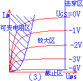 它的输出特性曲线如图(3)所示,它也分为4个区:可变电阻区、放大区、截止区和击穿区。
