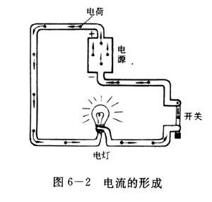 与此相似,在图6-2的电路中,电电源的正极聚集有正电荷,负极聚集有负电荷,在电源的正、负极间就产生了电压.这个电压可以使用路中的正电荷由正极流向负极,或者使用路中的负电行由负极流向正极(在金属导体中是后一种情况).这样在电路中就产生了电流.所以,电压使电路中形成了电流.