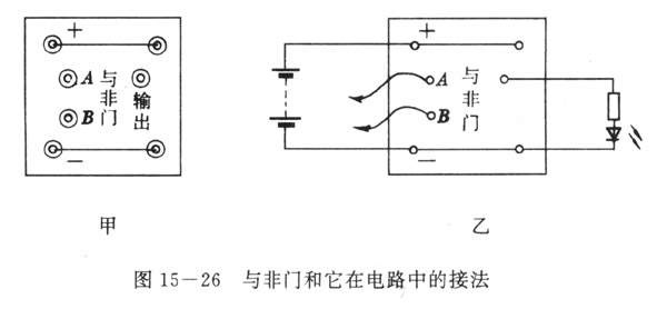 图15-26甲是我们实验用的与非门,它也有两个输入瑞A、B,图乙是它在电路中的接法。